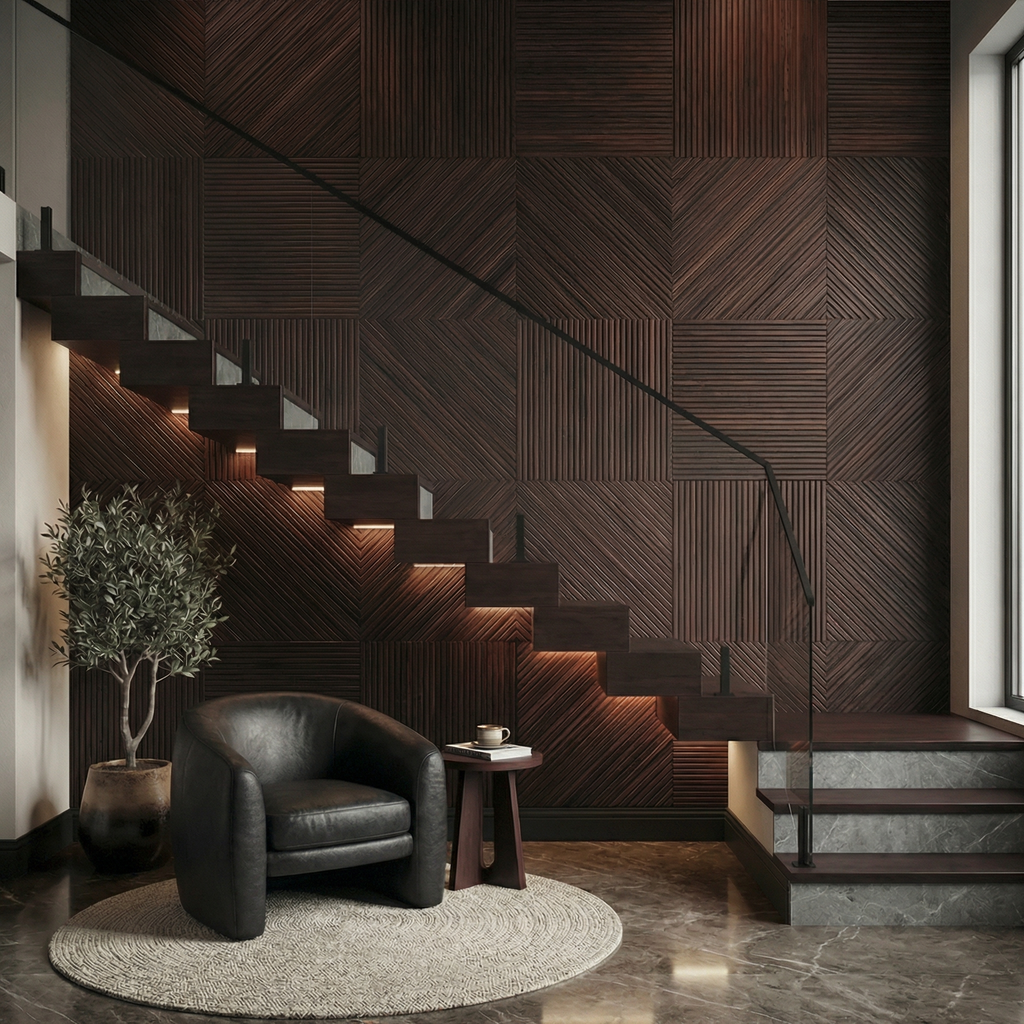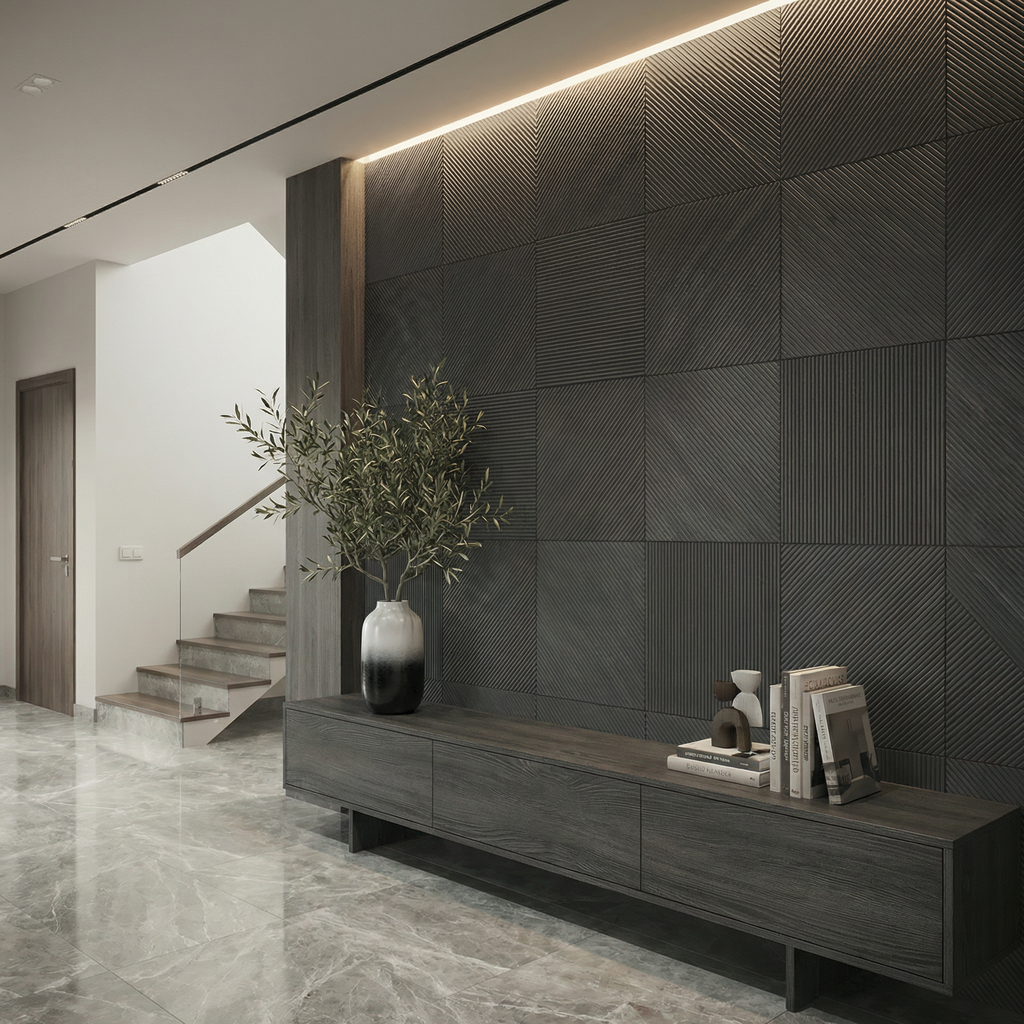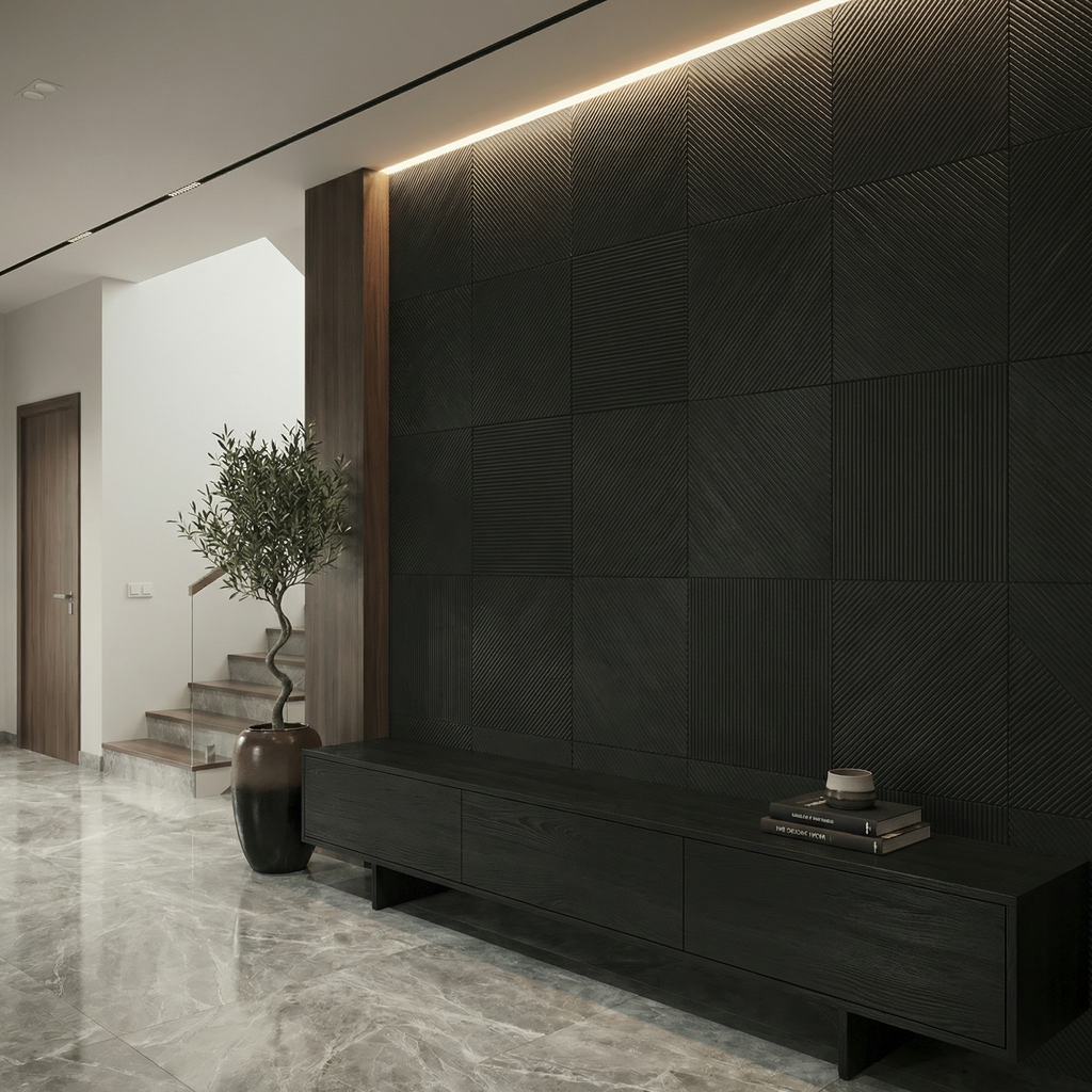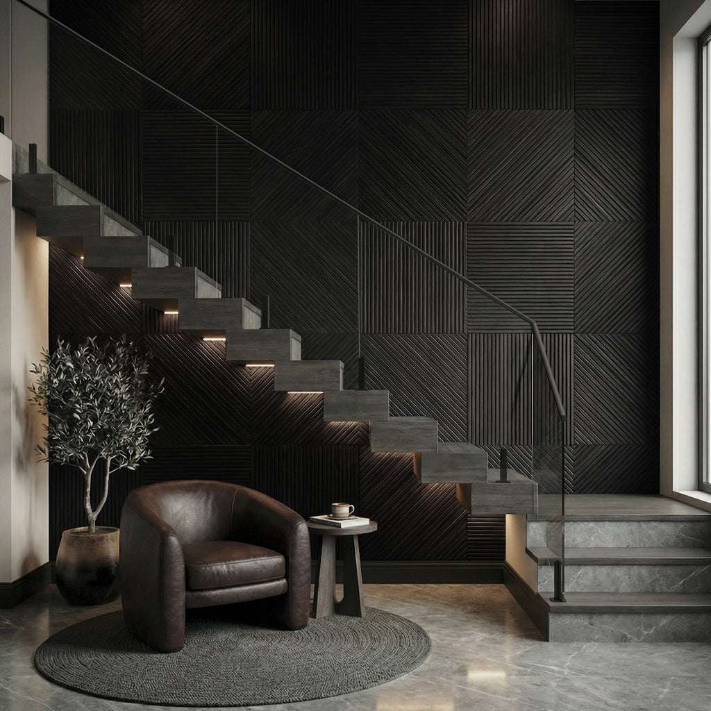 There are two designs, one straight and one diagonal - that we deliver in equal amounts with this statement wall.