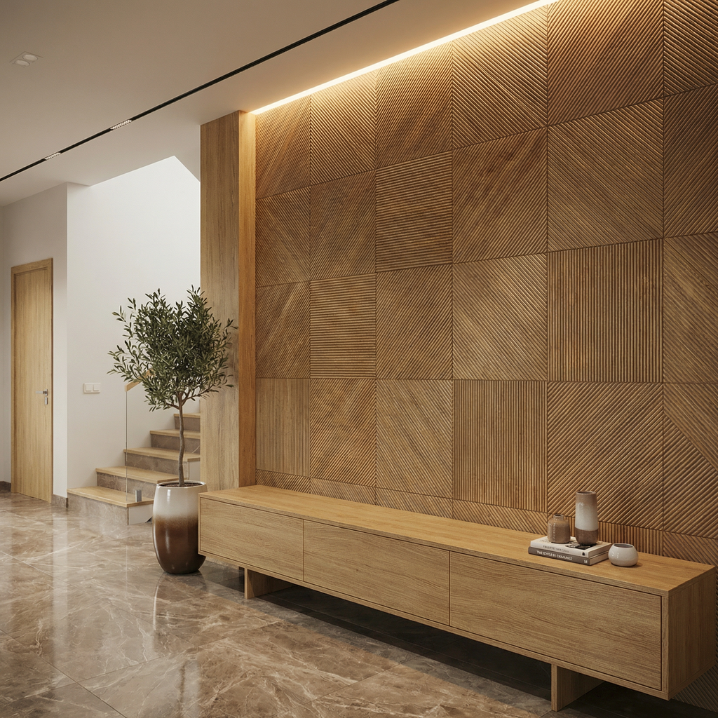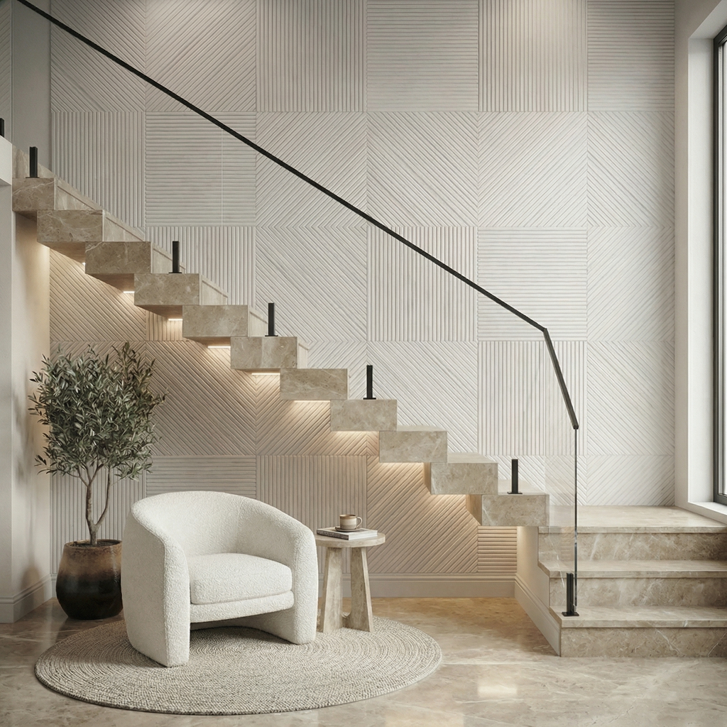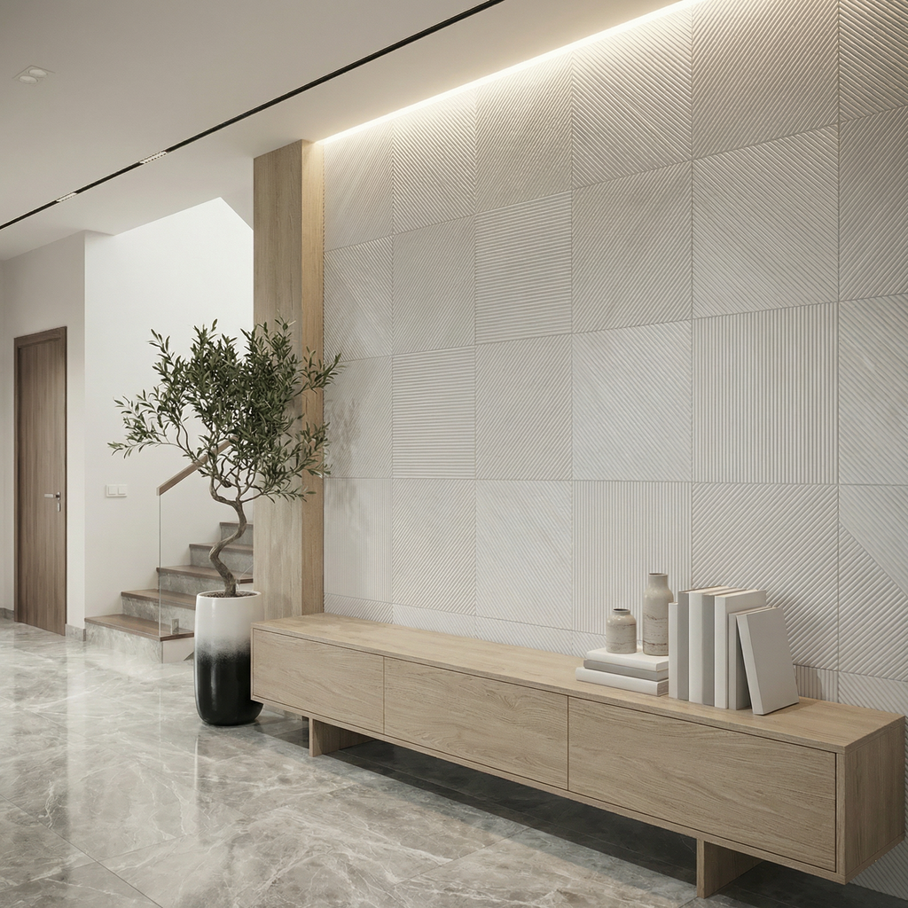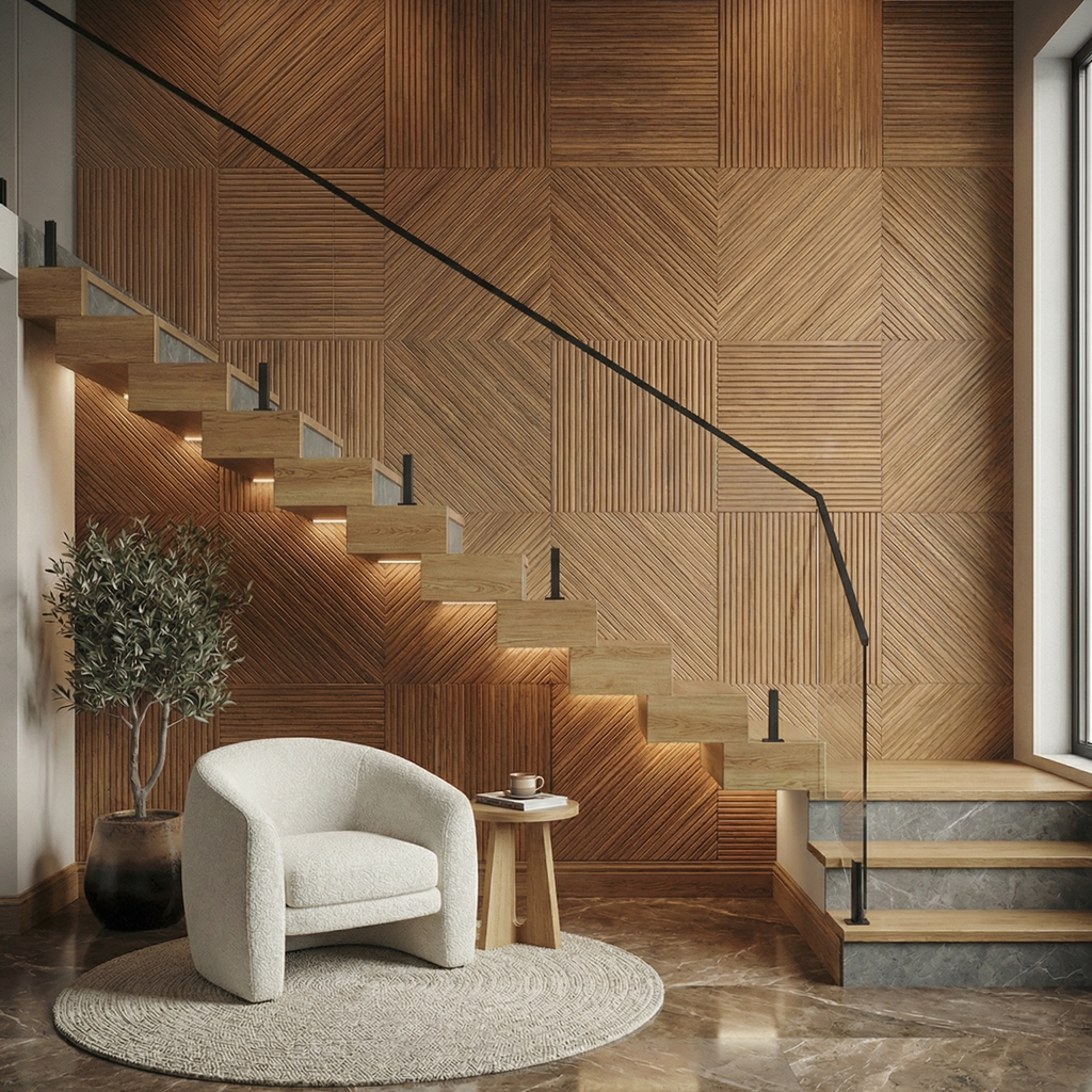 There are two designs, one straight and one diagonal - that we deliver in equal amounts with this statement wall.