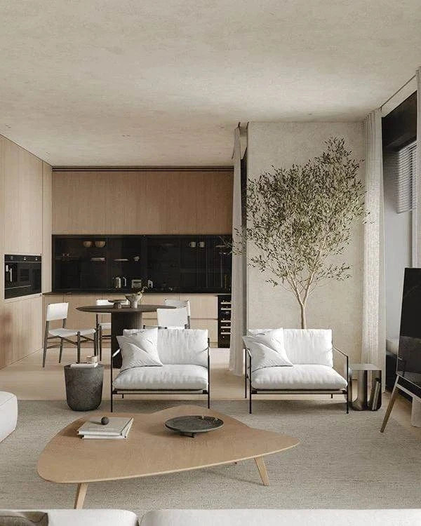 Neutral color palette, with a focus on lighter colors: white, cream and light brown from woods such as birch or white oak